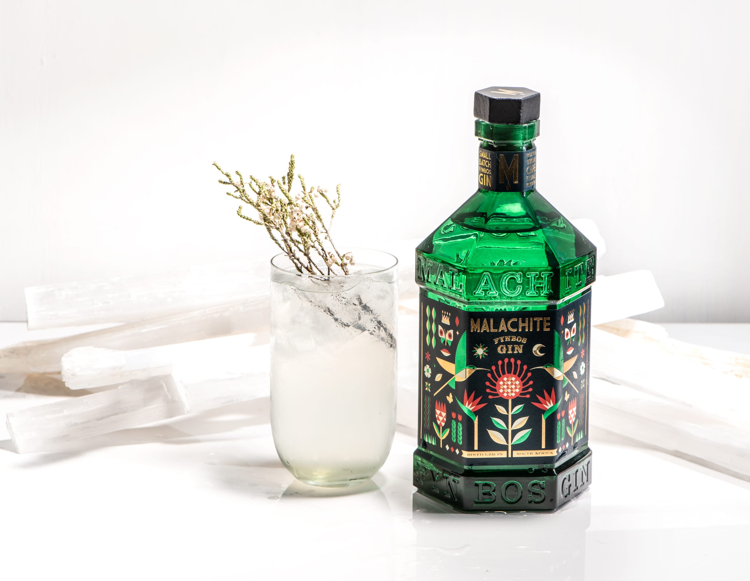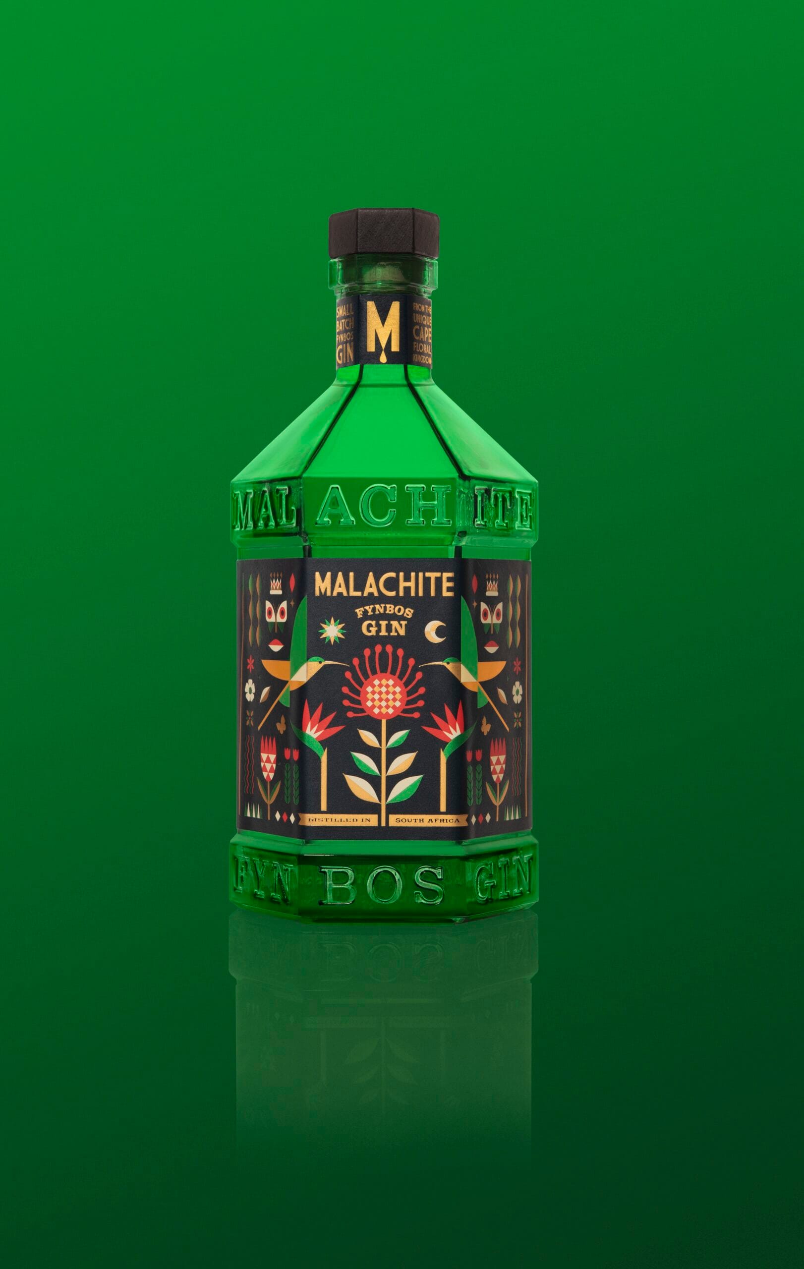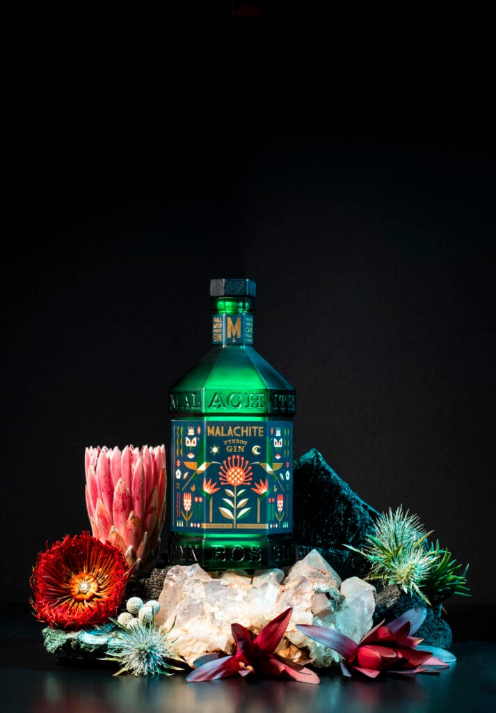 Malachite Gin se distingue aussi par sa bouteille hexagonale, clin d’œil aux six royaumes floraux du monde, dont le Cape Floral Kingdom. Le verre teinte vert profond, en hommage à la pierre de malachite, renforce l’identité naturelle et minérale du gin.